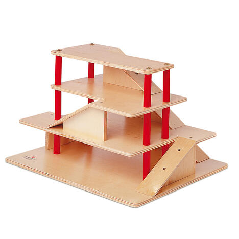 6 rampes relient les niveaux supérieurs et permettent la circulation. En contreplaqué verni avec des tubes teintés en rouge qui soutiennent les plateformes. En bois contreplaqué verni incolore et laqué rouge.