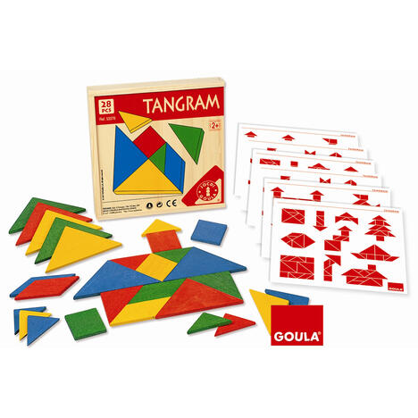 Boîte de 4 tangrams 28 pièces en bois + fiches modèles. Petites pastilles présentées en distributeur, 30 cartes images et règle du jeu.