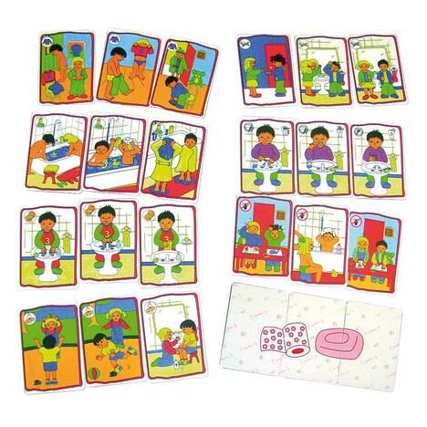 Jeu composé de 8 séquences de 3 cartes sur le thème de l'hygiène ; se laver, se brosser les cheveux, se brosser les dents, aller aux toilettes... Un système auto-correcteur au dos des cartes permet de vérifier si les cartes sont bien ordonnées. Contenu : 24 cartes en plastique de dimensions 11.5x8 cm livrées dans une valisette en plastique.